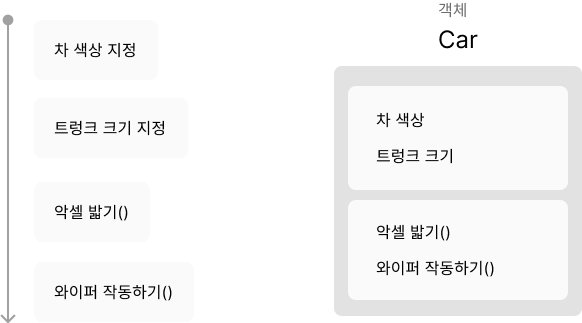예를 들어, 코드로 차를 만드는 과정을 나타낸다고 했을 때 왼쪽처럼 차와 관련 있는 속성이나 기능을 순서대로 만들 수도 있지만, 오른쪽처럼 하나의 덩어리(객체)로 묶을 수도 있다. 객체로 묶으면 코드를 더 깔끔하게 정리할 수 있다.