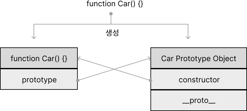 우리가 객체를 생성하면 객체의 원형인 prototype에 해당하는 object(Prototype Object)가 같이 생성된다. 우리가 생성한 객체 내부에는 prototype 속성이 생기고 이 속성은 prototype object를 참고한다. 그리고 prototype object에는 자동으로 constructor와 __proto__(= [[prototype]]) 속성이 생긴다. constructor는 생성한 원래 객체를 참조하며 __proto__는 객체가 생성될 때 조상이었던 함수의 prototype object를 가리킨다.