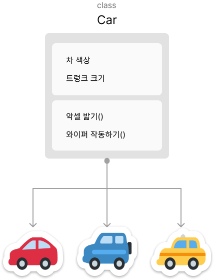 예를 들어 차를 만들 때 차의 색상을 지정하고, 트렁크의 크기를 지정해주어야 하며, 악셀을 밟을 수 있는 기능, 와이퍼가 작동할 수 있는 기능을 만들어야 한다면, 이 모든 기능을 포함하고 있는 차를 자동으로 만들어줄 수 있는 마법 기계가 class 인 것이다. 아직 만들어진 차는 없지만 기계를 작동만 한다면 차가 뚝딱뚝딱 생기는 것이다.
