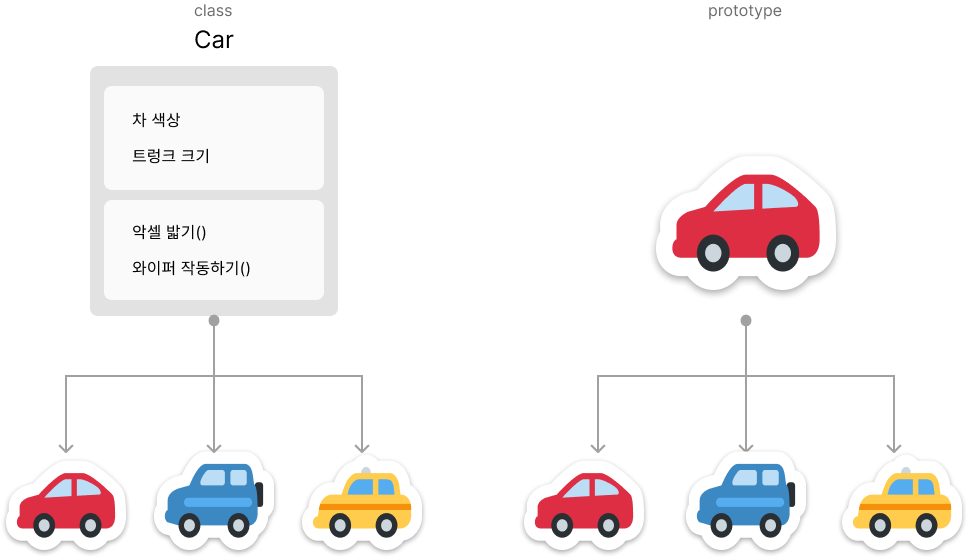 차를 만드는 예시를 살펴보면, class 기반 언어는 일종의 틀을 만들어두고 틀을 이용해 실제 자동차를 만든다면, prototype 기반 언어는 실제 차를 만들어두고 이 차를 고대로 가져와서 개조(?)해 사용한다고 생각하면 된다.