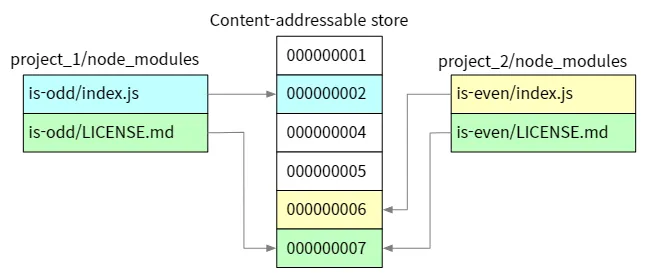 pnpm 공식 문서를 살펴보면 pnpm은 content-addressable store 방식을 사용해 디스크 공간을 절약하고자 했다. content-addressable store 방식은 전역 스토어에 종속성을 설치하고 심볼릭 링크와 하드 링크를 사용해서 디렉토리를 구성하는 방식이다. 전역 저장소에서 패키지를 공유하는 구조를 사용한다.