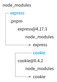 pnpm은 위 문제를 해결하기 위해 프로젝트에서 사용하는 의존성 패키지(dependencies/devDependencies)는 node_modules 폴더 바로 아래에 해당 패키지의 심볼릭 링크를 만든다.