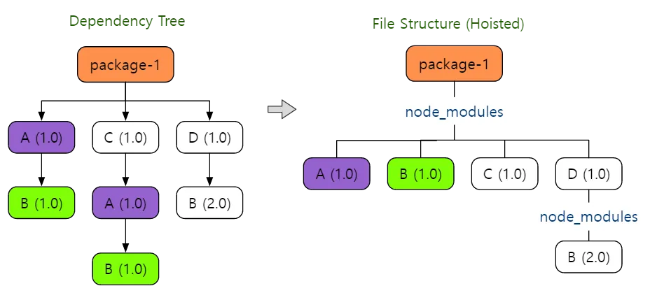 예를 들어 이미지의 왼쪽처럼 의존성 트리가 만들어진다고 가정하자. 여러 패키지가 A와 B에 의존할 때, 각각의 의존성에 따라node_modules 폴더에 중복으로 설치되어 디스크를 낭비하게 된다. 이를 보완하고자 npm(과 Yarn 1)은 이미지의 오른쪽처럼 중복되는 패키지를 끌어올리는(Hoisting) 방법을 사용했다.