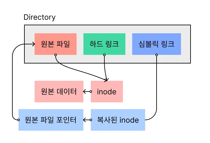 하드 링크는 원본 파일과 동일한 inode를 직접적으로 가리킨다. 심볼릭 링크는 inode를 복사한 뒤 복사한 inode를 가리킨다.
