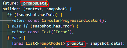 flutter에서 futurebuilder를 사용할 때 snapshot으로 받아오는 데이터는 코드에서 많이 사용하기 때문에 간결하게 prompts라고 짓고, future 타입의 변수는 이 변수와 구분짓기 위해 변수명에 data를 붙였었다. 하지만 이 이유도 코드를 읽어서 생각이 났다... 이럴 때는 변수명을 _prompstData가 아니라 _promptsFuture라고 짓는 게 좀 더 명확할 것 같다. (근데 변수명에 타입을 붙이는 게 좋은 건가...?)